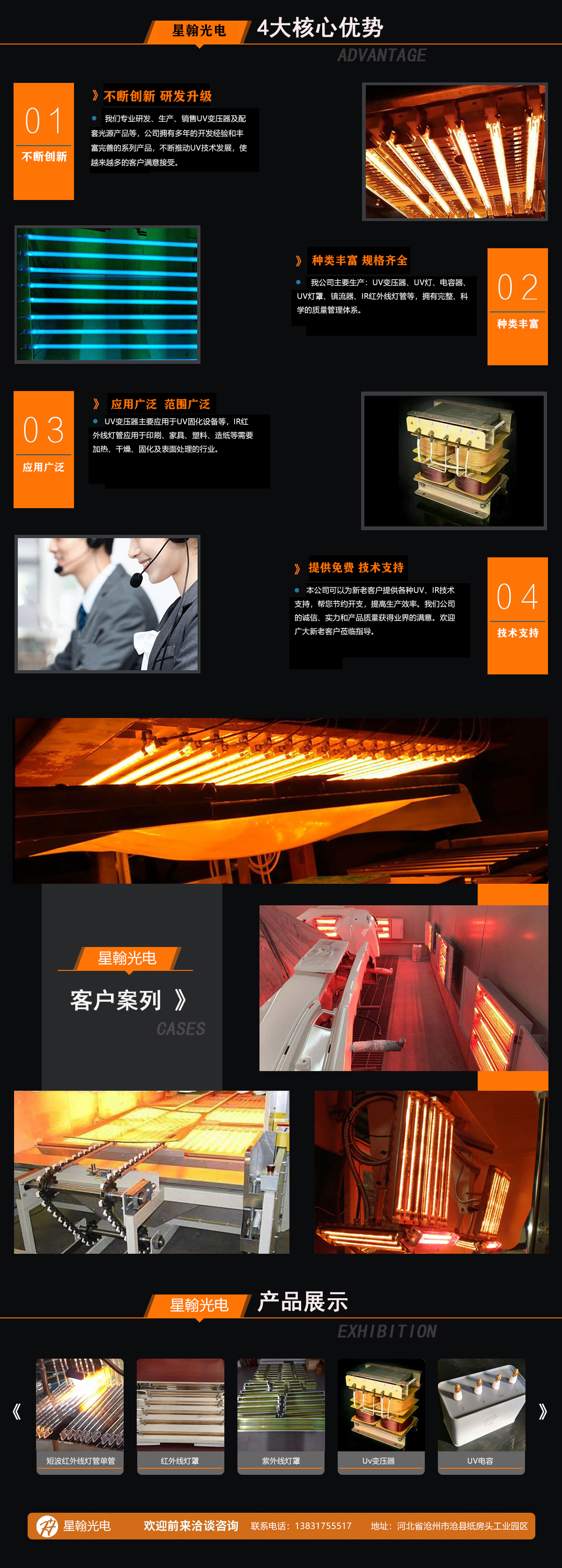 滄州星翰光電科技有限公司成立于 2002 年,我們專業研發、生產、銷售各類特種光源產品,配套電器等,公司擁有多年的開發經驗和豐富完善的系列產品,不斷推動 UV、IR 技術發展,使越來越多的客戶認可接受,前沿的技術、嚴格的產品質量管理和我們的專業知識、確保其與客戶的生產設備完全配套整合以專業熱誠、精準、速度迎向客戶!...